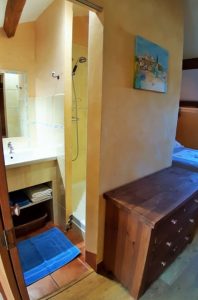 La chambre campagne peut accueillir de 2 à 5 personnes, elle dispose d’un lit double (140×190), d’un lit simple (90×190) et d’un lit « porte feuille » permettant 2 autres lits simples (90×190).